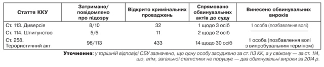 Додатково повідомляється, що в зазначений період за ст. 258—258-5 КК слідчими СБУ розслідувалося 1 661 кримінальне провадження стосовно 470 осіб. При цьому даних про винесення щодо них обвинувальних вироків за ст. 258 "прим" (втягнення у вчинення терактів, публічні заклики до них, створення тергрупи і фінансування тероризму) у відповіді СБУ немає. У 2015 р., сказано в документі, СБУ відкрито 11 кримінальних проваджень за ст. 113 ККУ і 109 — за ст. 258. При цьому за ст. 114 кримінальні провадження в ЄРДР упродовж першого кварталу ц.р.не реєструвалися DOCUMENT .
