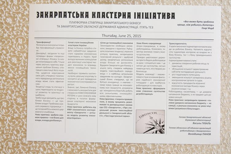 За підсумком зустрічі керівника області з топ-менеджерами компаній, які працюють на Закарпатті, та провідними представниками бізнесових кіл і роботодавців було ухвалено документ "Закарпатська кластерна ініціатива. Платформа співпраці Закарпатського бізнесу та Закарпатської облдержадміністрації". Основними тезами розробленого документу, який фіксує засади співпраці закарпатського бізнесу і влади, є такі: 1. Трансформація управління, згідно з ідеєю "не бізнес для влади, а влада для бізнесу", що передбачає співпрацю влади з бізнесом, реальну практику вирішення проблем бізнесу та допомогу в реалізації його ініціатив. 2. Готовність області стати інноваційним кластером України, основна мета – досягти від центральної влади економічного експерименту "Закарпаття – успішна модель розвитку економіки України". 3. Шлях до інноваційної економіки – йдеться про створення найкращої моделі інвестиційного середовища. Тут мова в першу чергу про закони, котрі б пожвавили економічну ситуацію в регіоні і державі (відновлення і доопрацювання законів "Про СЕЗ "Закарпаття"", "Про спеціальний режим інвестиційної діяльності в Закарпатській області", "Про інвестиційні парки"). 4. Нове бізнес-середовище – його становлення передбачає зокрема, і формування нового ставлення суспільства до роботодавців, моделі взаємодії і взаємоповаги із владою та громадою. 5. Транспарентність, що передбачає здорову взаємодію з владою та фіскальними і контролюючими органами, запровадження правила "головне джерело наповнення бюджету – не санкції, а реальна економіка за умов ініціативи і розуміння з боку влади". Також топ-менеджери сформували звернення до голови ОДА з проханням активізувати розгляд проблемних для закарпатського бізнесу питань та кроків із пожвавлення економічного розвитку у краї на рівні центральної влади, повідомили у прес-службі Закарпатської ОДА.