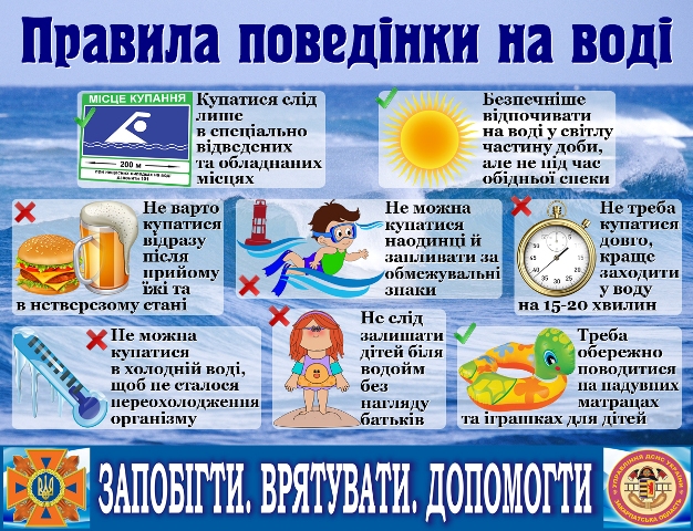 Перш за все, обирайте для купання спеціально відведені та обладнані місця, у крайньому разі – чистий пологий берег. Відпочивайте на воді вранці й ближче до вечора, коли сонце гріє, але немає небезпеки перегрівання. Не купайтеся відразу після прийому їжі та в нетверезому стані, а також не пірнайте після тривалого перебування на сонці. Температура води повинна бути не нижче +17°С, у більш холодній – перебувати небезпечно. Плавайте не більше 20 хвилин, причому цей час повинен збільшуватися поступово, починаючи з 3-5 хвилин.