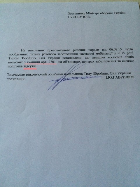 У повідомленні Бірюкова йдеться, що у січні-лютому 2015 року Міноборони отримало польову форму з тканини 2701 в кількості 10 тис. комплектів.