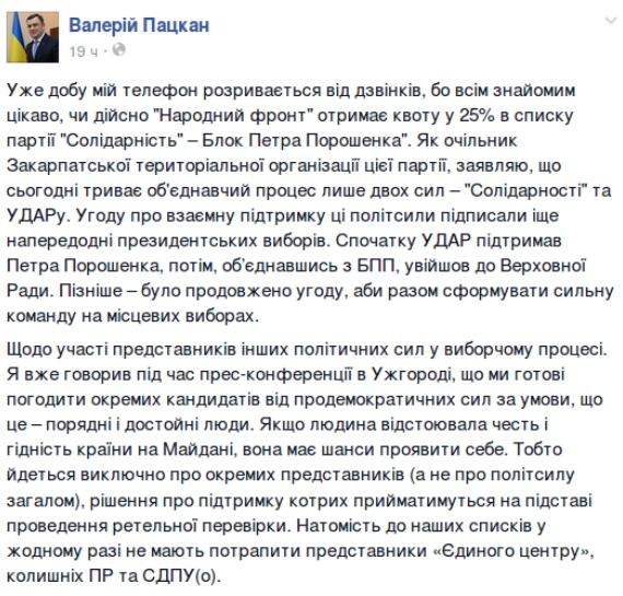 У своєму дописі у соціальній мережі фейсбук народний депутат, член фракції "Блок Петра Порошенка" Валерій Пацкан, прокоментував інформацію, що стосується ймовірного об’єднання "Солідарності - БПП" та УДАРу з третьою політичною силою – "Народним фронтом". Він зазначив, що отримав дуже багато телефонних дзвінків, адже "знайомим цікаво, чи дійсно "Народний фронт" отримає квоту у 25% в списку партії "Солідарність" – Блок Петра Порошенка"". Нардеп наголосив, що "сьогодні триває об'єднавчий процес лише двох сил – "Солідарності" та УДАРу, угоду про взаємну підтримку між якими було підписано іще напередодні президентських виборів. "Спочатку УДАР підтримав Петра Порошенка, потім, об’єднавшись з БПП, увійшов до Верховної Ради. Пізніше – було продовжено угоду, аби разом сформувати сильну команду на місцевих виборах", – пояснив він. Щодо участі представників інших політичних сил у виборчому процесі, Валерій Пацкан прокоментував: "Я вже говорив під час прес-конференції в Ужгороді, що ми готові погодити окремих кандидатів від продемократичних сил за умови, що це – порядні і достойні люди. Якщо людина відстоювала честь і гідність країни на Майдані, вона має шанси проявити себе. Тобто йдеться виключно про окремих представників (а не про політсилу загалом), рішення про підтримку котрих прийматимуться на підставі проведення ретельної перевірки. Натомість до наших списків у жодному разі не мають потрапити представники «Єдиного центру», колишніх ПР та СДПУ(о)".