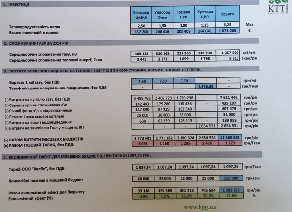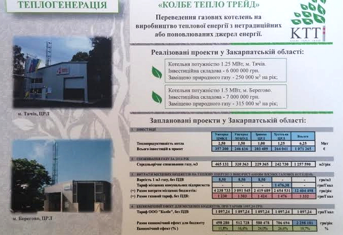 «Серед реалізованих проектів на Закарпатті – переведення газових котелень на виробництво теплової енергії. Так, у Тячеві та Берегові введено котельні на біопаливі. Перша – потужністю 1.25 МВт і яка заощаджує природній газ до 250 тис. кубометрів на рік, друга – потужністю 1.5 МВт і заміщує до 315 тис. кубометрів газу на рік, - розповів пан Ісаченко. - Крім того, ми взяли у концесію газові котельні двох районних лікарень та двох в обласному центрі, замінили технологічне обладнання (насоси, бойлери, лічильники, теплообмінники та інше), що надає можливість якісно і безперебійно в опалювальному сезоні надавати лікарням тепло.