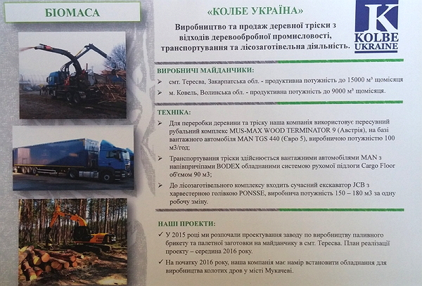Він також зазначив, що нині компанія має діючий виробничий майданчик в смт Тересва, на якому здійснюється переробка відходів деревини на тверду біомасу (деревна тріска). «Цьогоріч ми розпочали проектування заводу з виробництва паливного брикету та палетної заготівлі на цьому майданчику, - далі веде розмову пан Ісаченко. – Але через бюрократичну паперову тяганину та небажання місцевої влади сприяти реалізації проекту, він відкладається майже на рік».