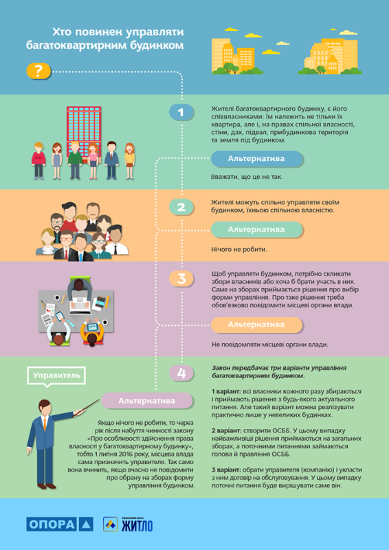 Із 1 липня набув чинності Закон України 417-VIII «Про особливості здійснення права власності у багатоквартирному будинку», який фактично скасував всевладдя ЖЕКів. Тепер громадяни можуть самостійно вирішувати, на що витрачати зібрані як квартплату гроші, коли і де робити ремонт, і навіть здавати в оренду перші поверхи, якщо дуже захочеться. Спільне управління майном багатоквартирних будинків – так це називається. І воно справді діє. ОСББ – це зареєстроване об'єднання співвласників багатоквартирних будинків, що створене для користування, обслуговування та управління своїм будинком. Суть у тому, що власники помешкань самі можуть обирати послуги і вирішувати, скільки грошей щомісяця виділяти на електрика, сантехніка, ремонт чи благоустрій.