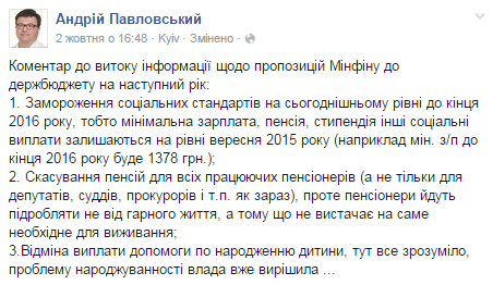 Екс-нардеп Андрій Павловський оприлюднив деякі пропозиції Міністерства фінансів України до держбюджету на 2016 рік. Так, серед них - заморозити соціальні стандарти, скасувати пенсії працюючим пенсіонерам і скасувати виплати допомоги при народженні дитини, пише ukr.obozrevatel.com.