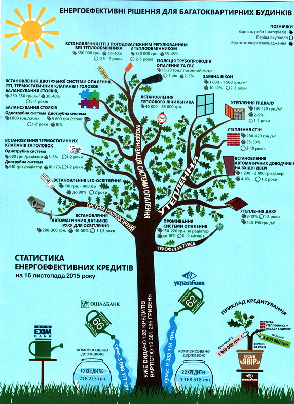 На житловий сектор припадає 25% споживання електроенергії, 40% споживання тепла. За відсутності теплоізоляції будівлі втрачають від 30 до50% тепла. А при правильному утепленні обсяги витрат газу можна скоротити на 25-30%,- кажуть фахівці. Прогнози по вартості енергоресурсів невтішна: до 2019 -2020 року за опалення українці можуть платити до 35 грн. на 1 м. кв. Нічого не робити - дуже поганий вихід із ситуації, - запевняють фахівці і наголошують: зараз хороший момент провести енергоефективні заходи за рахунок державних програм та банківських кредитів. Крім того, будинки, в яких створено ОСББ, а особливо такі, де проведено енергоефективні заходи, коштують на рикну нерухомості дорожче у порівнянні з іншими. Будь-які енергоефективні заходи дають право самостійно регулювати витрати. Є безліч компаній, які проводять енергоаудит ринку тощо, широкий вибір технологій, державні і місцеві програми підтримки тощо. На що можна брати кредити від ОСББ, частину коштів від яких компенсує держава. Це модернізація та заміна системи освітлення у під’їздах, тамбурах; теплоізоляція, утеплення стін; заміна вікон, утеплення підвалу, даху будинку.
