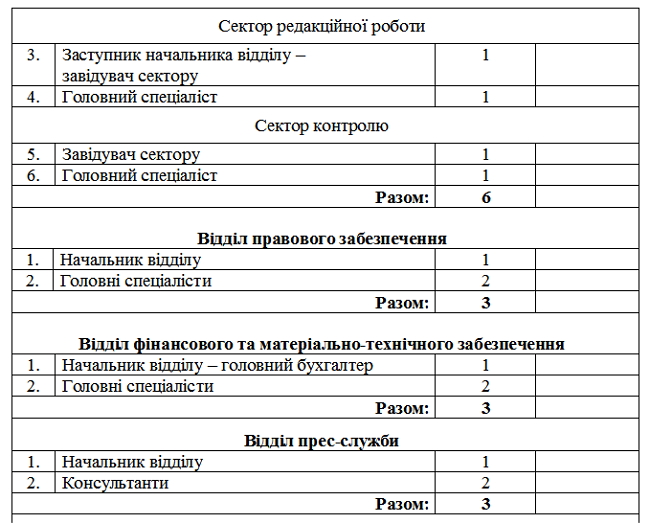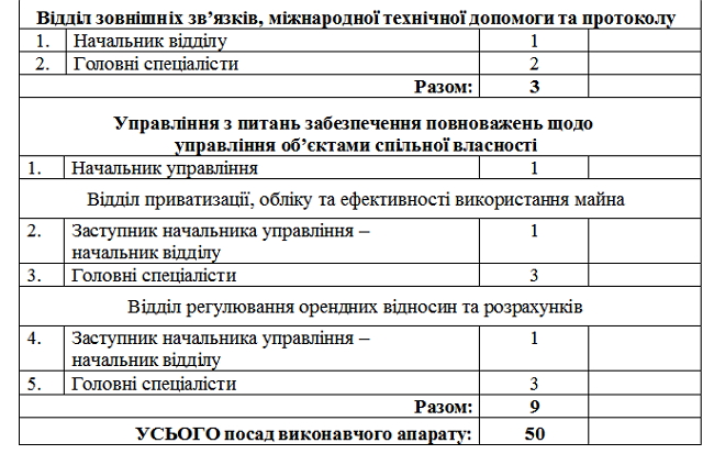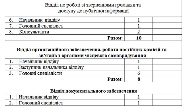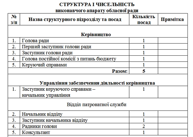 Відтепер в апараті облради працюватиме 50 осіб. Крім очільників облради, в апараті створено 2 у правління - із забезпечення діяльності керівництва та з питань забезпечення повноважень щодо управління об’єктами спільної власності, 10 відділів та 2 секторів.
