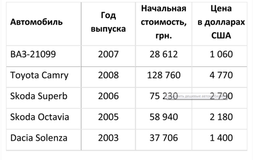 Окремими лотами виставлені автомобілі Toyota Camry 2008 року з початковою ціною 128,76 тис. грн, SKODA Superb Classic 2005 р.в. – 123,5 тис. грн, SKODA Superb Classic 2006 р.в. – 75,23 тис. грн і SKODA Octavia 2005 р.в. – 58,94 тис. грн та ін. Відкриті торги будуть проходити на сайті організатора торгів ТОВ «Кепіталс Прайс».