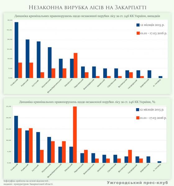 За даними прокуратури Закарпатської області, у 2015 році загалом кількість кримінальних правопорушень щодо незаконної порубки лісу за ст. 246 КК України склала 139. Найбільше незаконних рубок відбулося у Тячівському (29) та Рахівському (20) районах. «Не відстає» і Хуст – 19 кримінальних проваджень. Мукачівський район – 16 справ, Великоберезнянький та Міжгірський – по 10. Решта районів – менше десяти.