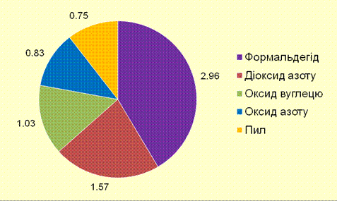 Порівняння середньої за місяць концентрації забруднюючих речовин із гранично допустимою середньодобовою концентрацією показало підвищений рівень забруднення формальдегідом (2,3 ГДК с. д.) та діоксидом азоту (1,6 ГДК с. д.); вміст оксиду азоту та оксиду вуглецю знаходився на рівні ГДК с. д..